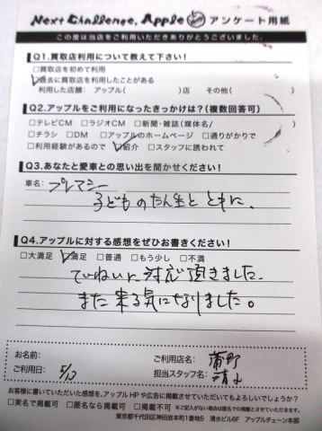 お車のご相談・ 査定だけでもOK! カンタン 入力 30秒 アップルがブランド買取始めました! お電話でも受付中! 受付時間10:00 ~ 19:00(新規ご査定の受付は18:30までとなります。) 0533-66-6666 お車のご相談・ 査定だけでもOK! カンタン 入力 30秒 アップルがブランド買取始めました! お電話でも受付中! 受付時間10:00 ~ 19:00(新規ご査定の受付は18:30までとなります。) 0533-66-6666 アップルがブランド買取始めました! お電話でも受付中! 受付時間10:00 ~ 19:00(新規ご査定の受付は18:30までとなります。) 0533-66-6666 店舗情報 在庫車 スタッフ紹介 ブログ お客様の声 キャンペーン お得 無料査定 click お客様の声 ご記入日: 2015/05/13 匿名希望様 愛車との思い出・・・プレマシー 子どものたん生とともにアップルへの感想・・・ていねいに対応頂きました。また来る気になりました。担当者より・・・思い出深い一台を査定させていただきありがとうございます。またいつでもお越しくださいね。買い替えはワクワクしますよね♪ 前へ 次へ お客様の声一覧を見る
