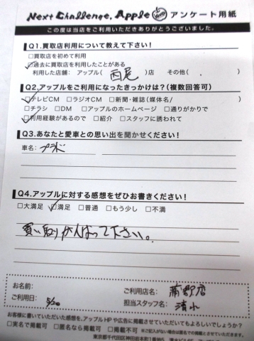お車のご相談・ 査定だけでもOK! カンタン 入力 30秒 アップルがブランド買取始めました! お電話でも受付中! 受付時間10:00 ~ 19:00(新規ご査定の受付は18:30までとなります。) 0533-66-6666 お車のご相談・ 査定だけでもOK! カンタン 入力 30秒 アップルがブランド買取始めました! お電話でも受付中! 受付時間10:00 ~ 19:00(新規ご査定の受付は18:30までとなります。) 0533-66-6666 アップルがブランド買取始めました! お電話でも受付中! 受付時間10:00 ~ 19:00(新規ご査定の受付は18:30までとなります。) 0533-66-6666 店舗情報 在庫車 スタッフ紹介 ブログ お客様の声 キャンペーン お得 無料査定 click お客様の声 ご記入日: 2015/05/20 匿名希望様 アップルへの感想・・・買い取りがんばって下さい。担当者より・・・頑張って行きます!!次の買い替えの時もご相談に来てくださいね♪スタッフみんなでお待ちしております♪ 前へ 次へ お客様の声一覧を見る