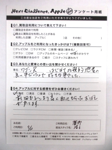 お車のご相談・ 査定だけでもOK! カンタン 入力 30秒 アップルがブランド買取始めました! お電話でも受付中! 受付時間10:00 ~ 19:00(新規ご査定の受付は18:30までとなります。) 0533-66-6666 お車のご相談・ 査定だけでもOK! カンタン 入力 30秒 アップルがブランド買取始めました! お電話でも受付中! 受付時間10:00 ~ 19:00(新規ご査定の受付は18:30までとなります。) 0533-66-6666 アップルがブランド買取始めました! お電話でも受付中! 受付時間10:00 ~ 19:00(新規ご査定の受付は18:30までとなります。) 0533-66-6666 店舗情報 在庫車 スタッフ紹介 ブログ お客様の声 キャンペーン お得 無料査定 click お客様の声 ご記入日: 2015/09/13 匿名希望様 愛車との思い出・・・ワゴンRはじめて比較的燃費の良い車だったので好きな車でした。アップルへの感想・・・前回もどこよりも高く取ってもらったおぼえがあります。担当者より・・・今回もガンバリました!!(笑)いつもアップルをご利用下さりありがとうございます。 前へ 次へ お客様の声一覧を見る
