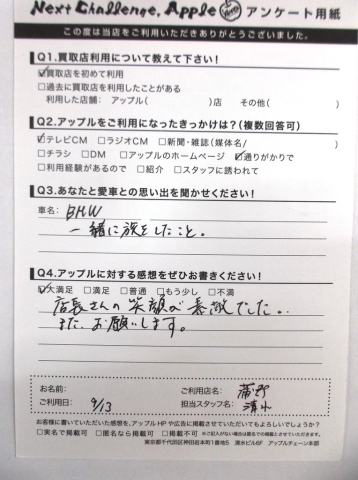 お車のご相談・ 査定だけでもOK! カンタン 入力 30秒 アップルがブランド買取始めました! お電話でも受付中! 受付時間10:00 ~ 19:00(新規ご査定の受付は18:30までとなります。) 0533-66-6666 お車のご相談・ 査定だけでもOK! カンタン 入力 30秒 アップルがブランド買取始めました! お電話でも受付中! 受付時間10:00 ~ 19:00(新規ご査定の受付は18:30までとなります。) 0533-66-6666 アップルがブランド買取始めました! お電話でも受付中! 受付時間10:00 ~ 19:00(新規ご査定の受付は18:30までとなります。) 0533-66-6666 店舗情報 在庫車 スタッフ紹介 ブログ お客様の声 キャンペーン お得 無料査定 click お客様の声 ご記入日: 2015/09/13 匿名希望様 愛車との思い出・・・BMW一緒に旅したこと。アップルへの感想・・・店長さんの笑顔が素敵でした。またお願いします。担当者より・・・笑顔をお褒め頂きありがとうございます。手放される際にはまたいつでもお越し下さいね!! 前へ 次へ お客様の声一覧を見る