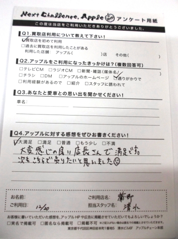 お車のご相談・ 査定だけでもOK! カンタン 入力 30秒 アップルがブランド買取始めました! お電話でも受付中! 受付時間10:00 ~ 19:00(新規ご査定の受付は18:30までとなります。) 0533-66-6666 お車のご相談・ 査定だけでもOK! カンタン 入力 30秒 アップルがブランド買取始めました! お電話でも受付中! 受付時間10:00 ~ 19:00(新規ご査定の受付は18:30までとなります。) 0533-66-6666 アップルがブランド買取始めました! お電話でも受付中! 受付時間10:00 ~ 19:00(新規ご査定の受付は18:30までとなります。) 0533-66-6666 店舗情報 在庫車 スタッフ紹介 ブログ お客様の声 キャンペーン お得 無料査定 click お客様の声 ご記入日: 2015/12/20 匿名希望様 アップルへの感想・・・大変感じの良い店長さんで満足です。次もこちらで売りたいと思いました(^▽^)担当者より・・・初めてのご利用ですぐにお譲り下さりオドロキました!!また次回もお越しください!! 前へ 次へ お客様の声一覧を見る