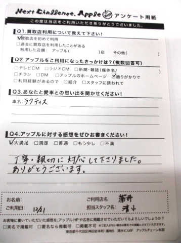 お車のご相談・ 査定だけでもOK! カンタン 入力 30秒 アップルがブランド買取始めました! お電話でも受付中! 受付時間10:00 ~ 19:00(新規ご査定の受付は18:30までとなります。) 0533-66-6666 お車のご相談・ 査定だけでもOK! カンタン 入力 30秒 アップルがブランド買取始めました! お電話でも受付中! 受付時間10:00 ~ 19:00(新規ご査定の受付は18:30までとなります。) 0533-66-6666 アップルがブランド買取始めました! お電話でも受付中! 受付時間10:00 ~ 19:00(新規ご査定の受付は18:30までとなります。) 0533-66-6666 店舗情報 在庫車 スタッフ紹介 ブログ お客様の声 キャンペーン お得 無料査定 click お客様の声 ご記入日: 2015/12/21 匿名希望様 アップルへの感想・・・丁寧・親切に対応して下さりました。ありがとうございます。担当者より・・・おクルマのことでわからないことはまたいつでもお問い合わせください。スタッフ一同心よりお待ち申し上げます。 前へ 次へ お客様の声一覧を見る