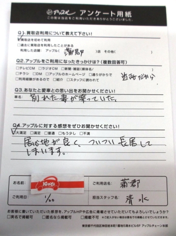 お車のご相談・ 査定だけでもOK! カンタン 入力 30秒 アップルがブランド買取始めました! お電話でも受付中! 受付時間10:00 ~ 19:00(新規ご査定の受付は18:30までとなります。) 0533-66-6666 お車のご相談・ 査定だけでもOK! カンタン 入力 30秒 アップルがブランド買取始めました! お電話でも受付中! 受付時間10:00 ~ 19:00(新規ご査定の受付は18:30までとなります。) 0533-66-6666 アップルがブランド買取始めました! お電話でも受付中! 受付時間10:00 ~ 19:00(新規ご査定の受付は18:30までとなります。) 0533-66-6666 店舗情報 在庫車 スタッフ紹介 ブログ お客様の声 キャンペーン お得 無料査定 click お客様の声 ご記入日: 2016/01/20 T.I様 車との思い出・・・別れた妻が乗っていた。アップルへの感想・・・居心地が良く、ついつい長居してしまいます。担当者より・・・またご来店してギターのお話しましょうね♪ 前へ 次へ お客様の声一覧を見る