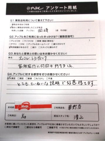 お車のご相談・ 査定だけでもOK! カンタン 入力 30秒 アップルがブランド買取始めました! お電話でも受付中! 受付時間10:00 ~ 19:00(新規ご査定の受付は18:30までとなります。) 0533-66-6666 お車のご相談・ 査定だけでもOK! カンタン 入力 30秒 アップルがブランド買取始めました! お電話でも受付中! 受付時間10:00 ~ 19:00(新規ご査定の受付は18:30までとなります。) 0533-66-6666 アップルがブランド買取始めました! お電話でも受付中! 受付時間10:00 ~ 19:00(新規ご査定の受付は18:30までとなります。) 0533-66-6666 店舗情報 在庫車 スタッフ紹介 ブログ お客様の声 キャンペーン お得 無料査定 click お客様の声 ご記入日: 2016/01/28 Y.T様 愛車との思い出・・・スバル トラヴィック家族旅行に何回も行きました。アップルへの感想・・・とてもていねいな説明で好感持てます。担当者より・・・なかなか見られない珍しいおクルマでしたね。大切に乗られてきたおクルマをありがとうございました。 前へ 次へ お客様の声一覧を見る