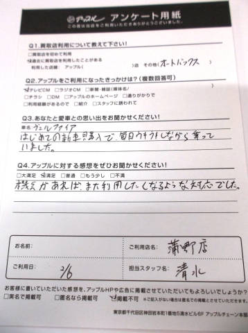 お車のご相談・ 査定だけでもOK! カンタン 入力 30秒 アップルがブランド買取始めました! お電話でも受付中! 受付時間10:00 ~ 19:00(新規ご査定の受付は18:30までとなります。) 0533-66-6666 お車のご相談・ 査定だけでもOK! カンタン 入力 30秒 アップルがブランド買取始めました! お電話でも受付中! 受付時間10:00 ~ 19:00(新規ご査定の受付は18:30までとなります。) 0533-66-6666 アップルがブランド買取始めました! お電話でも受付中! 受付時間10:00 ~ 19:00(新規ご査定の受付は18:30までとなります。) 0533-66-6666 店舗情報 在庫車 スタッフ紹介 ブログ お客様の声 キャンペーン お得 無料査定 click お客様の声 ご記入日: 2016/02/06 蒲郡市内のお客様様 愛車との思い出・・・ヴェルファイアはじめての新車購入で毎日ウキウキしながら乗っていました。アップルへの感想・・・機会があればまた利用したくなるような対応でした。担当者より・・・初めての『新車』って嬉しいですよね!!また次回もご利用くださいね♪ 前へ 次へ お客様の声一覧を見る