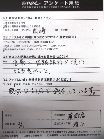 お車のご相談・ 査定だけでもOK! カンタン 入力 30秒 アップルがブランド買取始めました! お電話でも受付中! 受付時間10:00 ~ 19:00(新規ご査定の受付は18:30までとなります。) 0533-66-6666 お車のご相談・ 査定だけでもOK! カンタン 入力 30秒 アップルがブランド買取始めました! お電話でも受付中! 受付時間10:00 ~ 19:00(新規ご査定の受付は18:30までとなります。) 0533-66-6666 アップルがブランド買取始めました! お電話でも受付中! 受付時間10:00 ~ 19:00(新規ご査定の受付は18:30までとなります。) 0533-66-6666 店舗情報 在庫車 スタッフ紹介 ブログ お客様の声 キャンペーン お得 無料査定 click お客様の声 ご記入日: 2016/03/22 蒲郡市内のお客様様 愛車との思い出・・・通勤と家族旅行で使ってとても良かった。アップルへの感想・・・親切な対応で満足しています。担当者より・・・大切な思い出がたくさんつまったおクルマでしたね。次回もいつでもご来店下さいね♪ 前へ 次へ お客様の声一覧を見る
