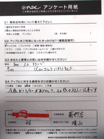お車のご相談・ 査定だけでもOK! カンタン 入力 30秒 アップルがブランド買取始めました! お電話でも受付中! 受付時間10:00 ~ 19:00(新規ご査定の受付は18:30までとなります。) 0533-66-6666 お車のご相談・ 査定だけでもOK! カンタン 入力 30秒 アップルがブランド買取始めました! お電話でも受付中! 受付時間10:00 ~ 19:00(新規ご査定の受付は18:30までとなります。) 0533-66-6666 アップルがブランド買取始めました! お電話でも受付中! 受付時間10:00 ~ 19:00(新規ご査定の受付は18:30までとなります。) 0533-66-6666 店舗情報 在庫車 スタッフ紹介 ブログ お客様の声 キャンペーン お得 無料査定 click お客様の声 ご記入日: 2016/03/06 K.S様 愛車との思い出・・・FIAT500 1.2ラウンジ 沢山ゴルフに行きました。アップルへの感想・・・今後おつき合いがあるとして、その後の対応次第です。担当者より・・・次回もご利用いただける様にスタッフ全員でガンバリマス。またいつでもお越しくださいね。 前へ 次へ お客様の声一覧を見る