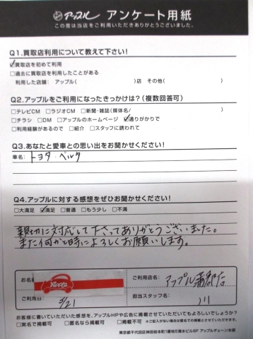お車のご相談・ 査定だけでもOK! カンタン 入力 30秒 アップルがブランド買取始めました! お電話でも受付中! 受付時間10:00 ~ 19:00(新規ご査定の受付は18:30までとなります。) 0533-66-6666 お車のご相談・ 査定だけでもOK! カンタン 入力 30秒 アップルがブランド買取始めました! お電話でも受付中! 受付時間10:00 ~ 19:00(新規ご査定の受付は18:30までとなります。) 0533-66-6666 アップルがブランド買取始めました! お電話でも受付中! 受付時間10:00 ~ 19:00(新規ご査定の受付は18:30までとなります。) 0533-66-6666 店舗情報 在庫車 スタッフ紹介 ブログ お客様の声 キャンペーン お得 無料査定 click お客様の声 ご記入日: 2016/03/21 M.K様 愛車との思い出・・・トヨタベルタアップルへの感想・・・親切に対応して下さってありがとうございました。また何かと時によろしくお願いします。担当者より・・・お客様の満足した笑顔が見れなくて残念です。むすめさんはいい車見つかりました?ご来店お待ちしております。 前へ 次へ お客様の声一覧を見る