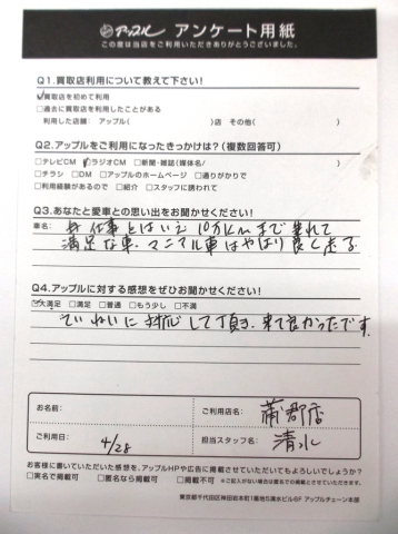 お車のご相談・ 査定だけでもOK! カンタン 入力 30秒 アップルがブランド買取始めました! お電話でも受付中! 受付時間10:00 ~ 19:00(新規ご査定の受付は18:30までとなります。) 0533-66-6666 お車のご相談・ 査定だけでもOK! カンタン 入力 30秒 アップルがブランド買取始めました! お電話でも受付中! 受付時間10:00 ~ 19:00(新規ご査定の受付は18:30までとなります。) 0533-66-6666 アップルがブランド買取始めました! お電話でも受付中! 受付時間10:00 ~ 19:00(新規ご査定の受付は18:30までとなります。) 0533-66-6666 店舗情報 在庫車 スタッフ紹介 ブログ お客様の声 キャンペーン お得 無料査定 click お客様の声 ご記入日: 2016/04/28 西尾のお客様様 愛車との思い出・・・・仕事とはいえ10万kmまで乗れて満足な車。マニュアル車はやはり良く走る。アップルへの感想・・・・ていねいに対応して頂き、来て良かったです。担当者より・・・・来て良かった・・・・を聴けて嬉しいです♪MT車は楽しいですよね♪ 前へ 次へ お客様の声一覧を見る