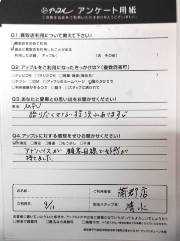 お車のご相談・ 査定だけでもOK! カンタン 入力 30秒 アップルがブランド買取始めました! お電話でも受付中! 受付時間10:00 ~ 19:00(新規ご査定の受付は18:30までとなります。) 0533-66-6666 お車のご相談・ 査定だけでもOK! カンタン 入力 30秒 アップルがブランド買取始めました! お電話でも受付中! 受付時間10:00 ~ 19:00(新規ご査定の受付は18:30までとなります。) 0533-66-6666 アップルがブランド買取始めました! お電話でも受付中! 受付時間10:00 ~ 19:00(新規ご査定の受付は18:30までとなります。) 0533-66-6666 店舗情報 在庫車 スタッフ紹介 ブログ お客様の声 キャンペーン お得 無料査定 click お客様の声 ご記入日: 2016/09/11 蒲郡市内のお客様様 愛車との思い出・・・MPV 語り尽くせない程沢山あります!!アップルへの感想・・・アドバイスが顧客目線で好感が持てました。担当者より・・・想い出がイッパイのおクルマを査定させて頂きありがとうございます!!買い替えされるときはまたお声をかけてくださいね♪ 前へ 次へ お客様の声一覧を見る