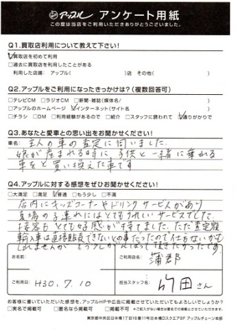 Q2.アップルに対する感想をお聞かせください!・・・店内にキッズコーナーやドリンクサービスがあり夏場の子連れにはとてもうれしいサービスでした。接客もとても好感が持てました。ただ査定額、輸入車は直接販売できないとの事だったので仕方ないかもしれませんが、もう少しがんばって頂きたかったです。