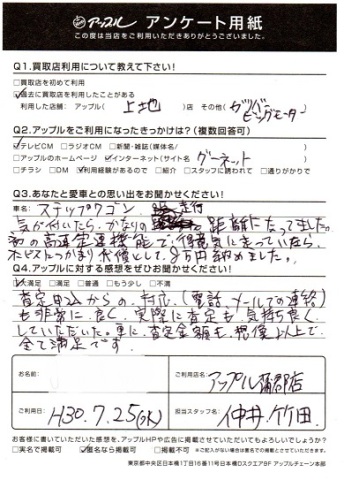 Q2.アップルに対する感想をお聞かせください!・・・査定申込からの対応(電話、メールでの連絡)も非常に良く、実際に査定も気持ち良くしていただいた。更に査定金額も想像以上で全て満足です。