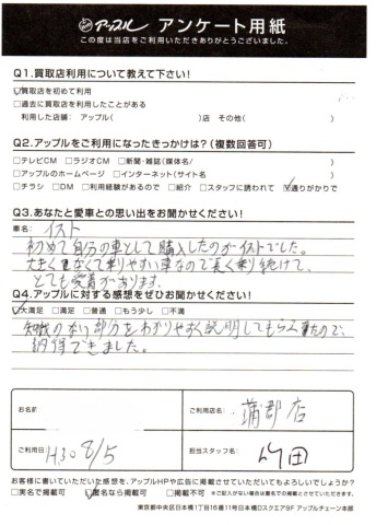 Q1.愛車との思い出をお聞かせください!・・・初めて自分の車として購入したのがイストでした。大きくなくて乗りやすい車なので長く乗り続けて、とても愛着があります。