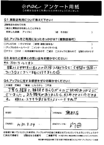 Q2.アップルに対する感想をお聞かせください!・・・丁寧な接客と、雑談も交えながらのご説明ありがとうございました。また機会がありましたら、利用させていただきます。娘さん、ステキな車と出会えるといいですね!!