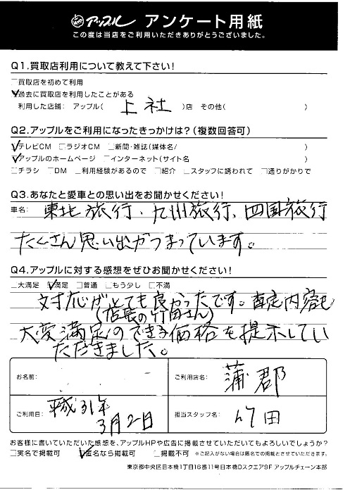 Q1.愛車との思い出をお聞かせください!・・・東北旅行、九州旅行、四国旅行たくさん思い出がうまっています。