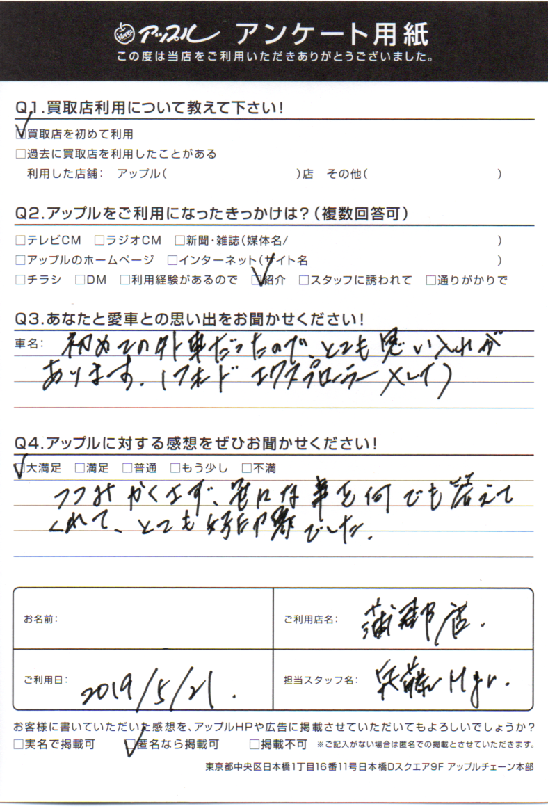 お車のご相談・ 査定だけでもOK! カンタン 入力 30秒 アップルがブランド買取始めました! お電話でも受付中! 受付時間10:00 ~ 19:00(新規ご査定の受付は18:30までとなります。) 0533-66-6666 お車のご相談・ 査定だけでもOK! カンタン 入力 30秒 アップルがブランド買取始めました! お電話でも受付中! 受付時間10:00 ~ 19:00(新規ご査定の受付は18:30までとなります。) 0533-66-6666 アップルがブランド買取始めました! お電話でも受付中! 受付時間10:00 ~ 19:00(新規ご査定の受付は18:30までとなります。) 0533-66-6666 店舗情報 在庫車 スタッフ紹介 ブログ お客様の声 キャンペーン お得 無料査定 click お客様の声 ご記入日: 2019/05/21 匿名希望様 車名:フォード エクスプローラー つつみかくさず、色々な事を何でも答えてくれて、とても好印象でした。 前へ 次へ お客様の声一覧を見る