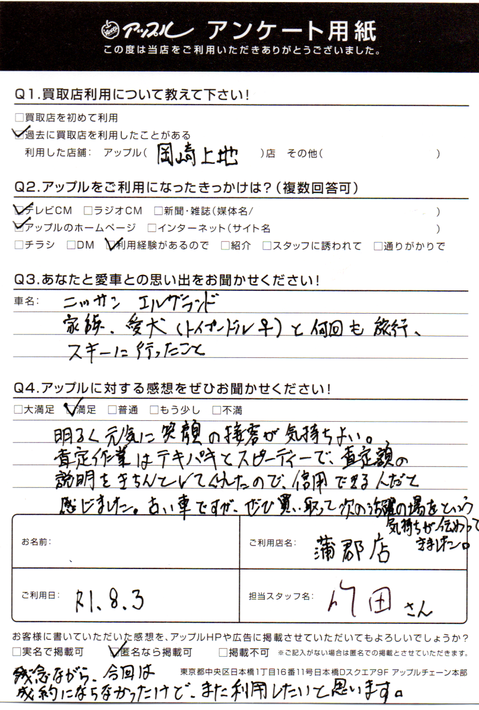 明るく元気に笑顔の接客が気持ちよい。査定作業はテキパキとスピーディーで査定額の説明をきちんとしてくれたので、信用できる人だと感じました。古い車ですが、ぜひ買い取って次の活躍の場をという気持ちが伝わってきました。残念ながら、今回は成約にならなかったけど、また利用したいと思います。
