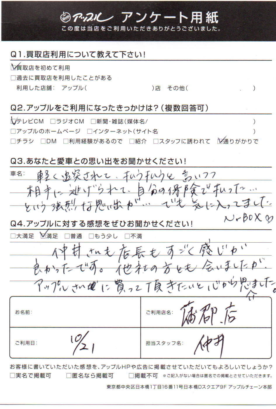 お車のご相談・ 査定だけでもOK! カンタン 入力 30秒 アップルがブランド買取始めました! お電話でも受付中! 受付時間10:00 ~ 19:00(新規ご査定の受付は18:30までとなります。) 0533-66-6666 お車のご相談・ 査定だけでもOK! カンタン 入力 30秒 アップルがブランド買取始めました! お電話でも受付中! 受付時間10:00 ~ 19:00(新規ご査定の受付は18:30までとなります。) 0533-66-6666 アップルがブランド買取始めました! お電話でも受付中! 受付時間10:00 ~ 19:00(新規ご査定の受付は18:30までとなります。) 0533-66-6666 店舗情報 在庫車 スタッフ紹介 ブログ お客様の声 キャンペーン お得 無料査定 click お客様の声 ご記入日: 2019/10/21 匿名希望様 仲井さんも店長もすごく感じが良かったです。他社の方とも会いましたが、アップルさんに買っていただきたいと心から思いました。 前へ 次へ お客様の声一覧を見る
