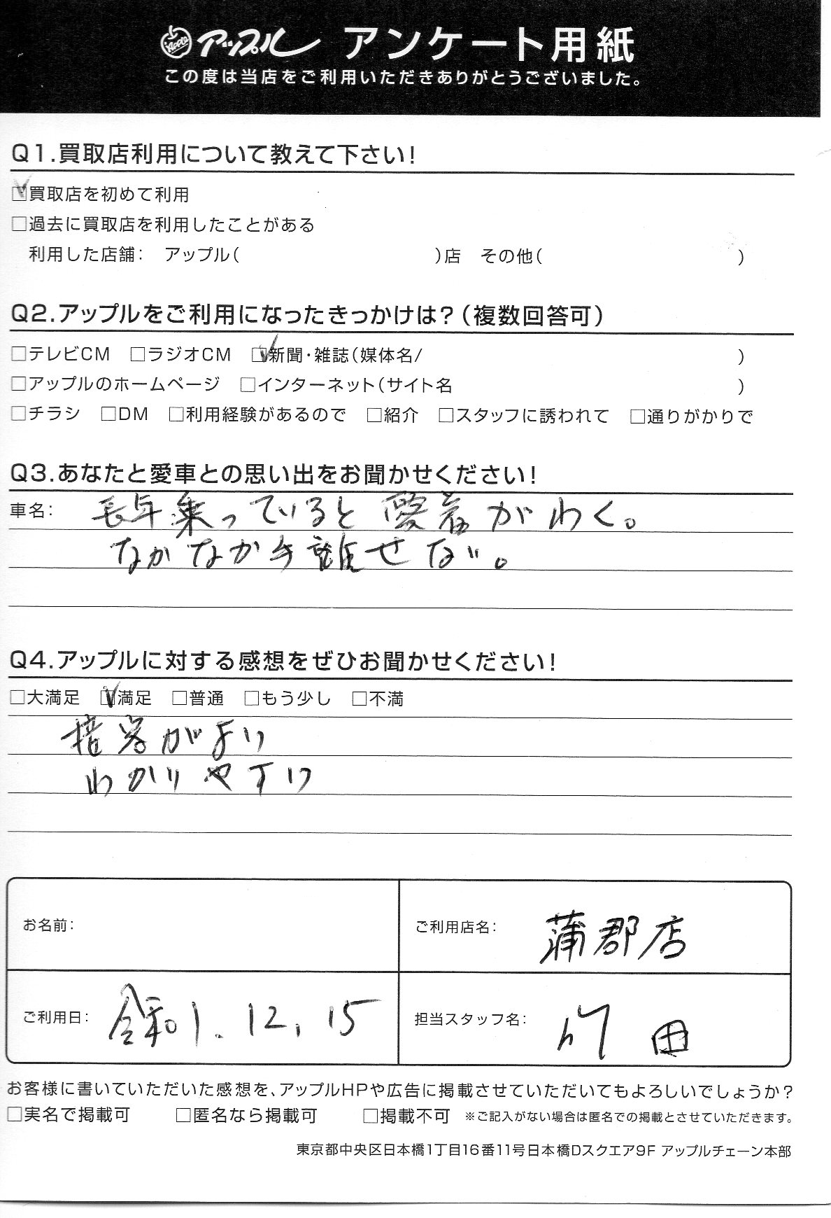 お車のご相談・ 査定だけでもOK! カンタン 入力 30秒 アップルがブランド買取始めました! お電話でも受付中! 受付時間10:00 ~ 19:00(新規ご査定の受付は18:30までとなります。) 0533-66-6666 お車のご相談・ 査定だけでもOK! カンタン 入力 30秒 アップルがブランド買取始めました! お電話でも受付中! 受付時間10:00 ~ 19:00(新規ご査定の受付は18:30までとなります。) 0533-66-6666 アップルがブランド買取始めました! お電話でも受付中! 受付時間10:00 ~ 19:00(新規ご査定の受付は18:30までとなります。) 0533-66-6666 店舗情報 在庫車 スタッフ紹介 ブログ お客様の声 キャンペーン お得 無料査定 click お客様の声 ご記入日: 2019/12/15 匿名希望様 接客がよい わかりやすい 前へ 次へ お客様の声一覧を見る