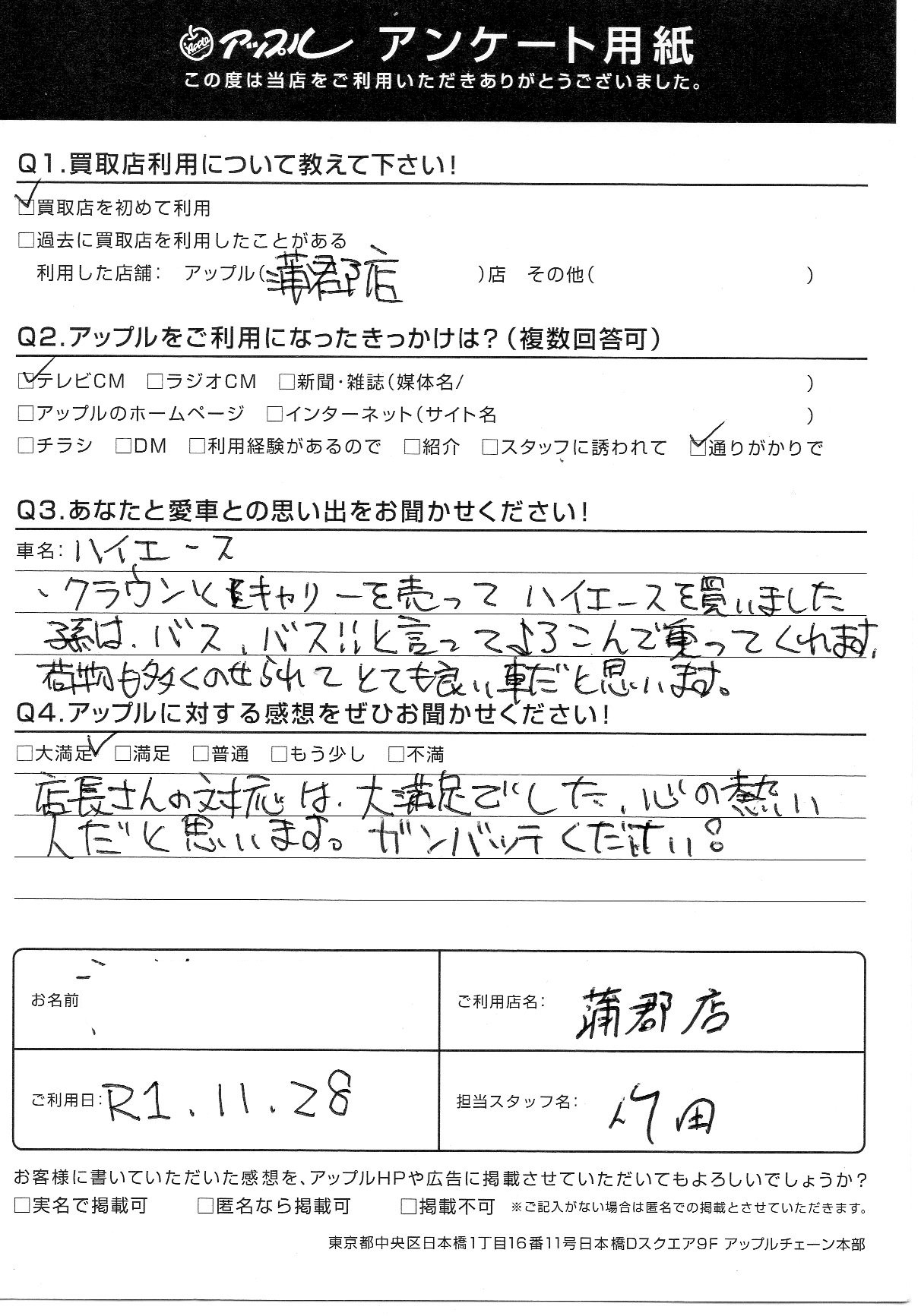 お車のご相談・ 査定だけでもOK! カンタン 入力 30秒 アップルがブランド買取始めました! お電話でも受付中! 受付時間10:00 ~ 19:00(新規ご査定の受付は18:30までとなります。) 0533-66-6666 お車のご相談・ 査定だけでもOK! カンタン 入力 30秒 アップルがブランド買取始めました! お電話でも受付中! 受付時間10:00 ~ 19:00(新規ご査定の受付は18:30までとなります。) 0533-66-6666 アップルがブランド買取始めました! お電話でも受付中! 受付時間10:00 ~ 19:00(新規ご査定の受付は18:30までとなります。) 0533-66-6666 店舗情報 在庫車 スタッフ紹介 ブログ お客様の声 キャンペーン お得 無料査定 click お客様の声 ご記入日: 2019/11/28 愛知県 匿名希望様 車名:トヨタ ハイエースバン 店長さんの対応は大満足でした。心の熱い人だと思います。ガンバッテください。 前へ 次へ お客様の声一覧を見る
