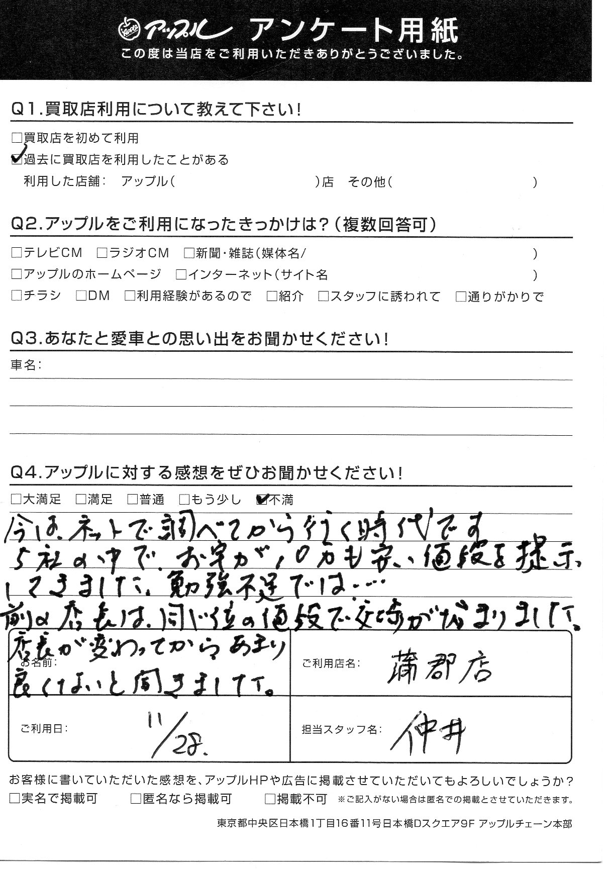 お車のご相談・ 査定だけでもOK! カンタン 入力 30秒 アップルがブランド買取始めました! お電話でも受付中! 受付時間10:00 ~ 19:00(新規ご査定の受付は18:30までとなります。) 0533-66-6666 お車のご相談・ 査定だけでもOK! カンタン 入力 30秒 アップルがブランド買取始めました! お電話でも受付中! 受付時間10:00 ~ 19:00(新規ご査定の受付は18:30までとなります。) 0533-66-6666 アップルがブランド買取始めました! お電話でも受付中! 受付時間10:00 ~ 19:00(新規ご査定の受付は18:30までとなります。) 0533-66-6666 店舗情報 在庫車 スタッフ紹介 ブログ お客様の声 キャンペーン お得 無料査定 click お客様の声 ご記入日: 2019/11/28 愛知県 匿名希望様 今は、ネットで調べてから行く時代です。5社の中でお宅が10万も安い値段を提示してきました。勉強不足では…。前の店長は同じくらいの値段で交渉がきまりました。店長が変わってからあまりよくないと聞きました。 前へ 次へ お客様の声一覧を見る