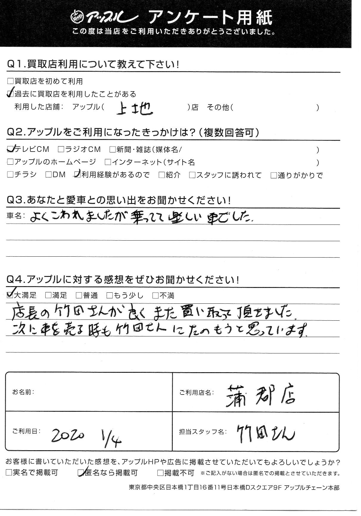 お車のご相談・ 査定だけでもOK! カンタン 入力 30秒 アップルがブランド買取始めました! お電話でも受付中! 受付時間10:00 ~ 19:00(新規ご査定の受付は18:30までとなります。) 0533-66-6666 お車のご相談・ 査定だけでもOK! カンタン 入力 30秒 アップルがブランド買取始めました! お電話でも受付中! 受付時間10:00 ~ 19:00(新規ご査定の受付は18:30までとなります。) 0533-66-6666 アップルがブランド買取始めました! お電話でも受付中! 受付時間10:00 ~ 19:00(新規ご査定の受付は18:30までとなります。) 0533-66-6666 店舗情報 在庫車 スタッフ紹介 ブログ お客様の声 キャンペーン お得 無料査定 click お客様の声 ご記入日: 2020/01/04 匿名希望様 店長の竹田さんが良く、また買い取って頂きました。次に車を売る時も竹田さんにたのもうと思っています。 前へ 次へ お客様の声一覧を見る