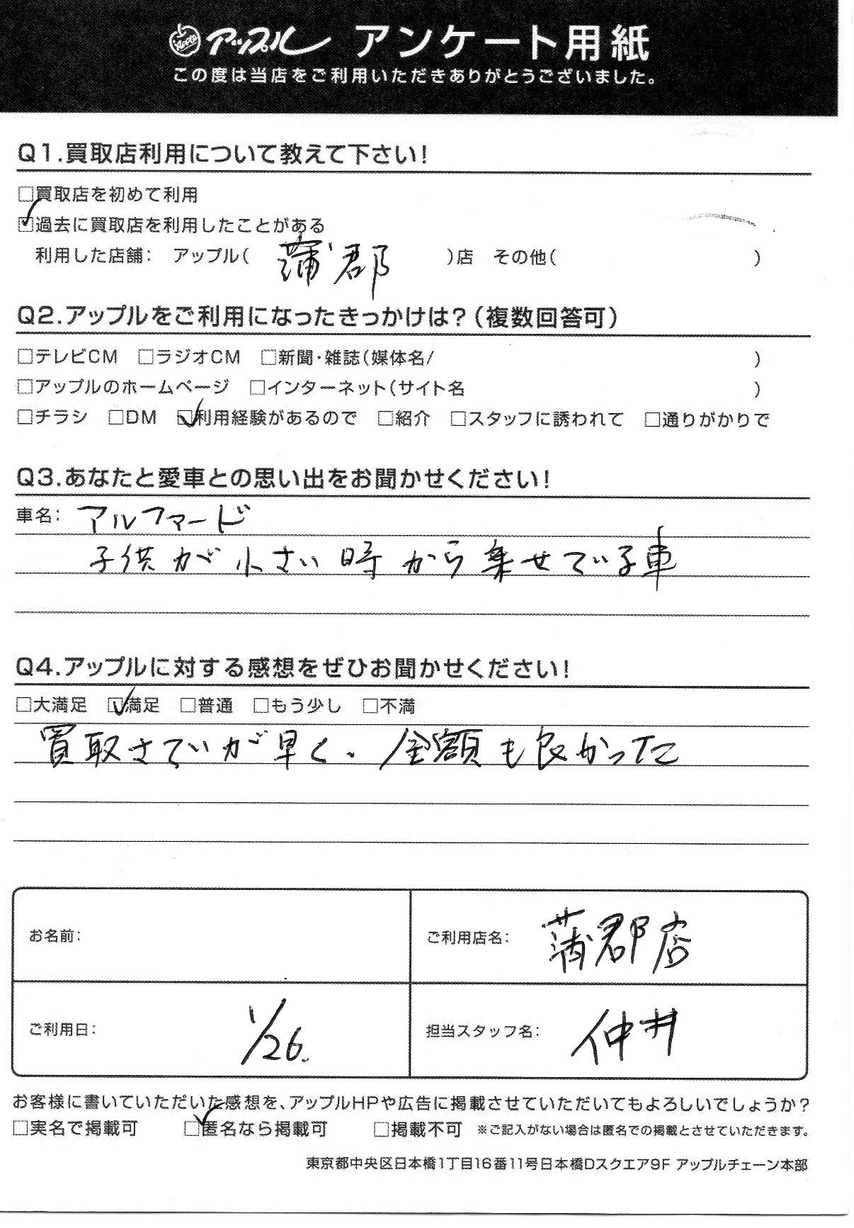 お車のご相談・ 査定だけでもOK! カンタン 入力 30秒 アップルがブランド買取始めました! お電話でも受付中! 受付時間10:00 ~ 19:00(新規ご査定の受付は18:30までとなります。) 0533-66-6666 お車のご相談・ 査定だけでもOK! カンタン 入力 30秒 アップルがブランド買取始めました! お電話でも受付中! 受付時間10:00 ~ 19:00(新規ご査定の受付は18:30までとなります。) 0533-66-6666 アップルがブランド買取始めました! お電話でも受付中! 受付時間10:00 ~ 19:00(新規ご査定の受付は18:30までとなります。) 0533-66-6666 店舗情報 在庫車 スタッフ紹介 ブログ お客様の声 キャンペーン お得 無料査定 click お客様の声 ご記入日: 2020/01/26 匿名希望様 車名:トヨタ アルファード(H27年1月~のHYBRID含む) 買取さていが早く、金額も良かった。 前へ 次へ お客様の声一覧を見る