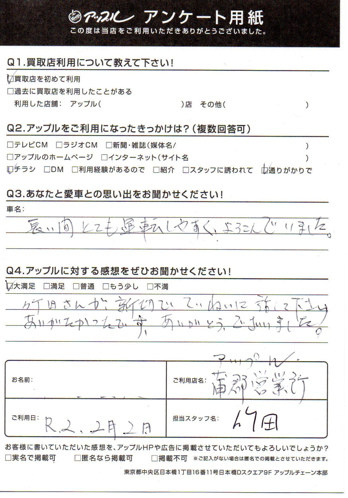 お車のご相談・ 査定だけでもOK! カンタン 入力 30秒 アップルがブランド買取始めました! お電話でも受付中! 受付時間10:00 ~ 19:00(新規ご査定の受付は18:30までとなります。) 0533-66-6666 お車のご相談・ 査定だけでもOK! カンタン 入力 30秒 アップルがブランド買取始めました! お電話でも受付中! 受付時間10:00 ~ 19:00(新規ご査定の受付は18:30までとなります。) 0533-66-6666 アップルがブランド買取始めました! お電話でも受付中! 受付時間10:00 ~ 19:00(新規ご査定の受付は18:30までとなります。) 0533-66-6666 店舗情報 在庫車 スタッフ紹介 ブログ お客様の声 キャンペーン お得 無料査定 click お客様の声 ご記入日: 2020/02/02 匿名希望様 竹田さんが親切でていねいに話して下さりありがたかったです。ありがとうございました。 前へ 次へ お客様の声一覧を見る