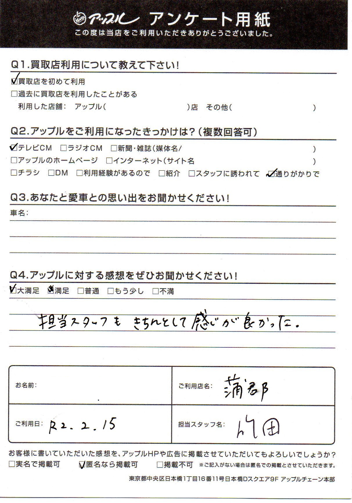 お車のご相談・ 査定だけでもOK! カンタン 入力 30秒 アップルがブランド買取始めました! お電話でも受付中! 受付時間10:00 ~ 19:00(新規ご査定の受付は18:30までとなります。) 0533-66-6666 お車のご相談・ 査定だけでもOK! カンタン 入力 30秒 アップルがブランド買取始めました! お電話でも受付中! 受付時間10:00 ~ 19:00(新規ご査定の受付は18:30までとなります。) 0533-66-6666 アップルがブランド買取始めました! お電話でも受付中! 受付時間10:00 ~ 19:00(新規ご査定の受付は18:30までとなります。) 0533-66-6666 店舗情報 在庫車 スタッフ紹介 ブログ お客様の声 キャンペーン お得 無料査定 click お客様の声 ご記入日: 2020/02/15 匿名希望様 担当スタッフもきちんとして感じが良かった。 前へ 次へ お客様の声一覧を見る