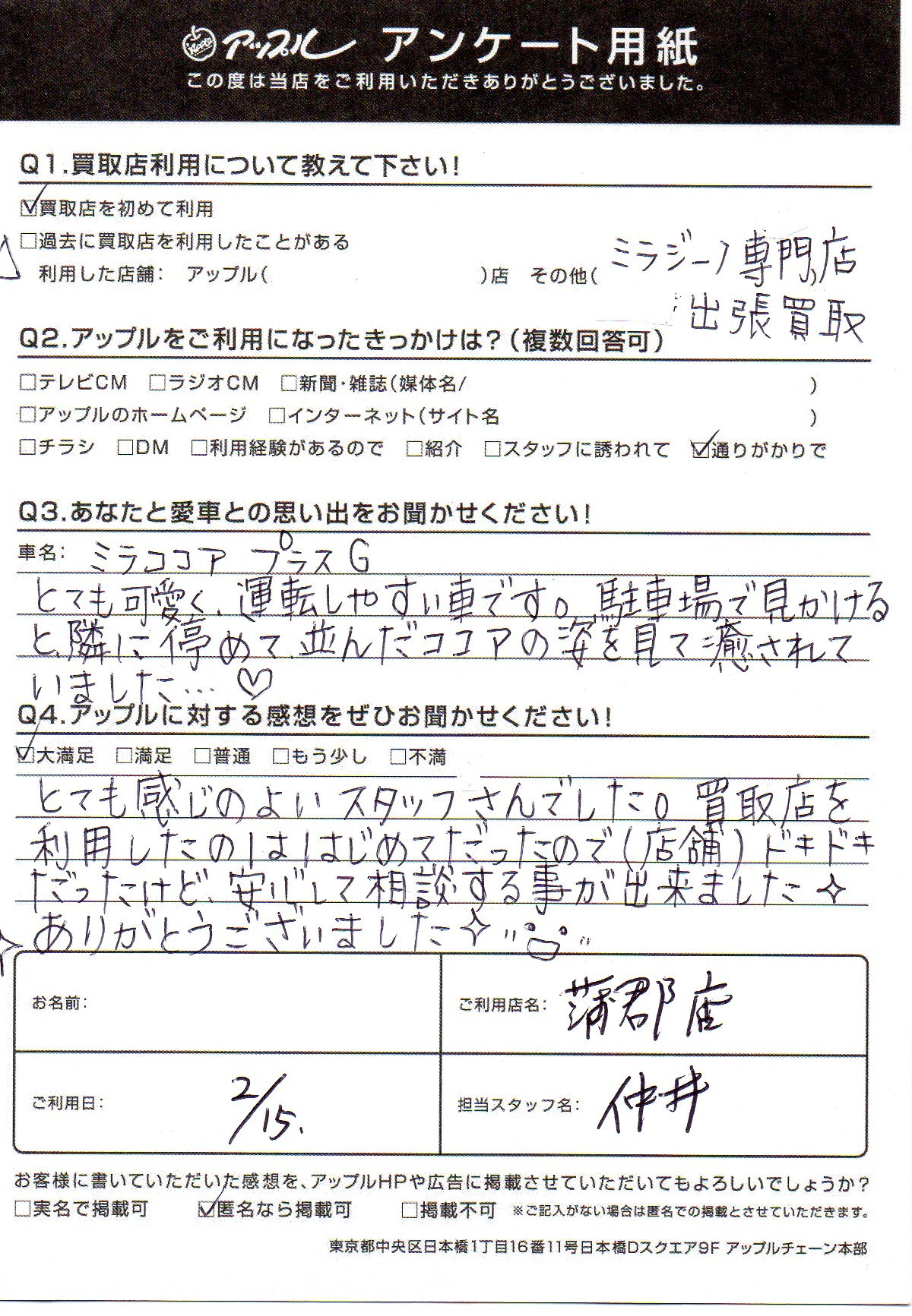 お車のご相談・ 査定だけでもOK! カンタン 入力 30秒 アップルがブランド買取始めました! お電話でも受付中! 受付時間10:00 ~ 19:00(新規ご査定の受付は18:30までとなります。) 0533-66-6666 お車のご相談・ 査定だけでもOK! カンタン 入力 30秒 アップルがブランド買取始めました! お電話でも受付中! 受付時間10:00 ~ 19:00(新規ご査定の受付は18:30までとなります。) 0533-66-6666 アップルがブランド買取始めました! お電話でも受付中! 受付時間10:00 ~ 19:00(新規ご査定の受付は18:30までとなります。) 0533-66-6666 店舗情報 在庫車 スタッフ紹介 ブログ お客様の声 キャンペーン お得 無料査定 click お客様の声 ご記入日: 2020/02/15 匿名希望様 車名:ダイハツ ミラココア とても感じの良いスタッフさんでした。買取店を利用したのは初めてだったので(店舗)ドキドキだったけど。安心して相談することができました。ありがとうございます。 前へ 次へ お客様の声一覧を見る