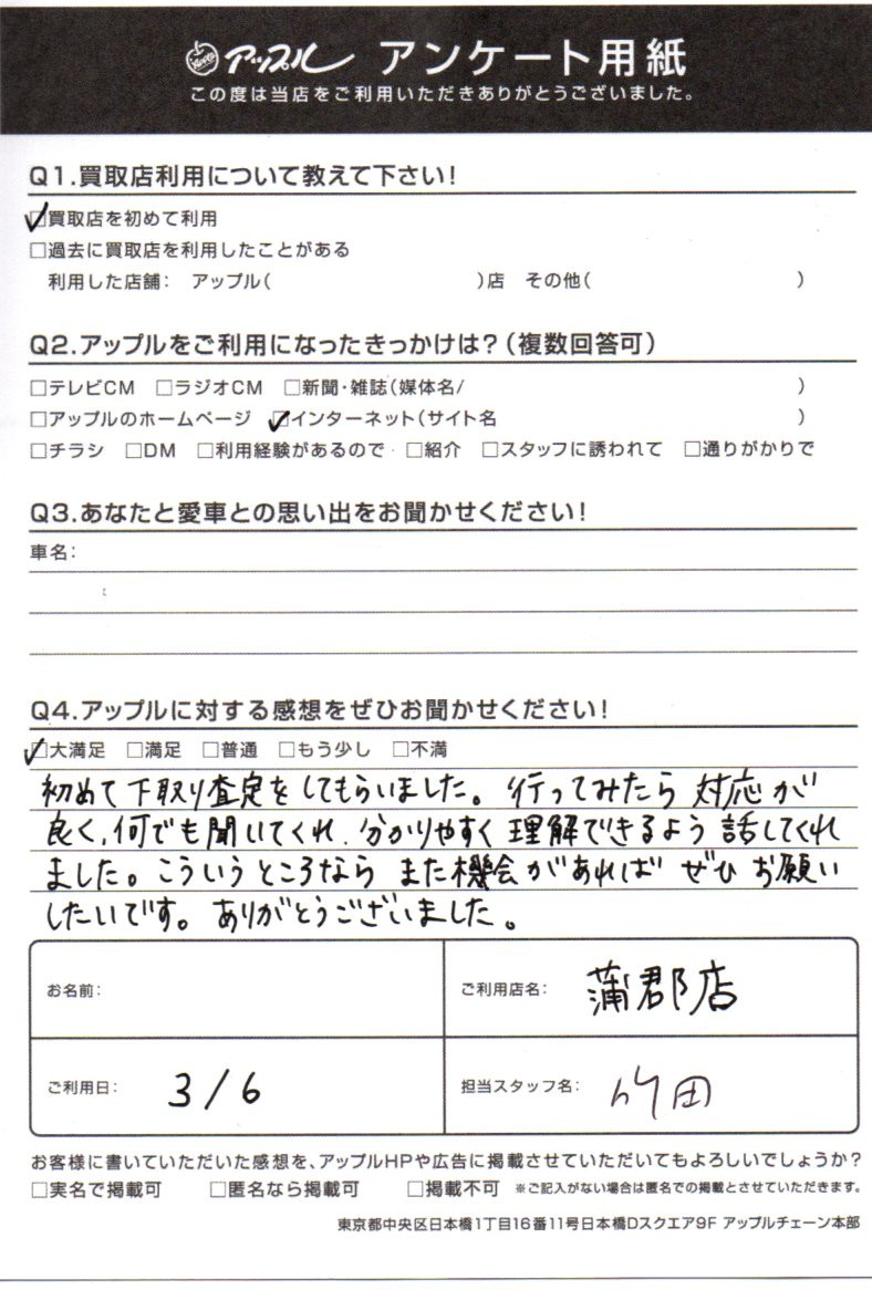 お車のご相談・ 査定だけでもOK! カンタン 入力 30秒 アップルがブランド買取始めました! お電話でも受付中! 受付時間10:00 ~ 19:00(新規ご査定の受付は18:30までとなります。) 0533-66-6666 お車のご相談・ 査定だけでもOK! カンタン 入力 30秒 アップルがブランド買取始めました! お電話でも受付中! 受付時間10:00 ~ 19:00(新規ご査定の受付は18:30までとなります。) 0533-66-6666 アップルがブランド買取始めました! お電話でも受付中! 受付時間10:00 ~ 19:00(新規ご査定の受付は18:30までとなります。) 0533-66-6666 店舗情報 在庫車 スタッフ紹介 ブログ お客様の声 キャンペーン お得 無料査定 click お客様の声 ご記入日: 2020/03/06 愛知県 匿名希望様 初めて下取りの査定をしてもらいました。行ってみたら対応が良く、何でも聞いてくれ、分かりやすく理解できるよう話してくれました。こういうところなら、また機会があればぜひお願いしたいです。ありがとうございました。 前へ 次へ お客様の声一覧を見る