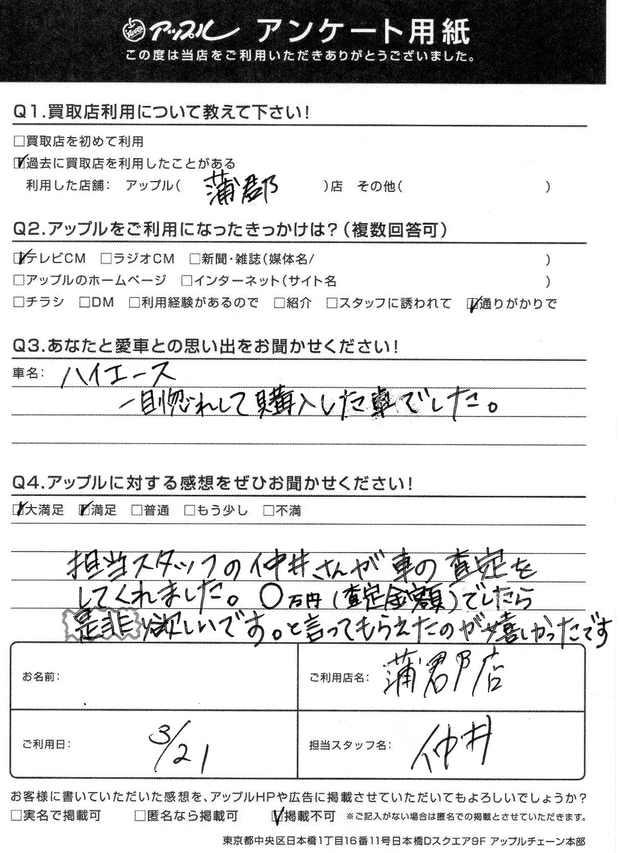 お車のご相談・ 査定だけでもOK! カンタン 入力 30秒 アップルがブランド買取始めました! お電話でも受付中! 受付時間10:00 ~ 19:00(新規ご査定の受付は18:30までとなります。) 0533-66-6666 お車のご相談・ 査定だけでもOK! カンタン 入力 30秒 アップルがブランド買取始めました! お電話でも受付中! 受付時間10:00 ~ 19:00(新規ご査定の受付は18:30までとなります。) 0533-66-6666 アップルがブランド買取始めました! お電話でも受付中! 受付時間10:00 ~ 19:00(新規ご査定の受付は18:30までとなります。) 0533-66-6666 店舗情報 在庫車 スタッフ紹介 ブログ お客様の声 キャンペーン お得 無料査定 click お客様の声 ご記入日: 2020/03/21 愛知県 匿名希望様 車名:トヨタ ハイエースバン 担当スタッフの仲井さんが車の査定をしてくれました。〇万円(査定金額)でしたら是非欲しいです。と言ってもらえたのが嬉しかったです。 前へ 次へ お客様の声一覧を見る