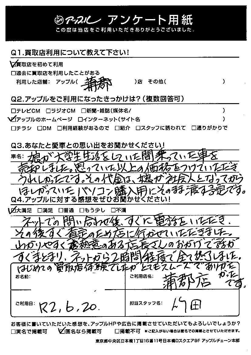 ネットでの問い合わせ後、すぐに電話をいただき、その後すぐ査定のための店に行かせていただきました。わかりやすく熱意のある店長さんのおかげで話がすぐまとまり、ネットから2時間程度ですべて終了しました。はじめての買取店体験でしたがとてもスムースでありがたかったです。