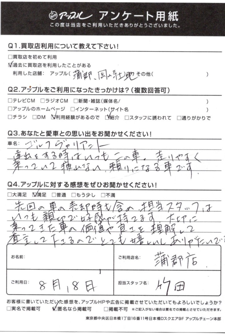 お車のご相談・ 査定だけでもOK! カンタン 入力 30秒 アップルがブランド買取始めました! お電話でも受付中! 受付時間10:00 ~ 19:00(新規ご査定の受付は18:30までとなります。) 0533-66-6666 お車のご相談・ 査定だけでもOK! カンタン 入力 30秒 アップルがブランド買取始めました! お電話でも受付中! 受付時間10:00 ~ 19:00(新規ご査定の受付は18:30までとなります。) 0533-66-6666 アップルがブランド買取始めました! お電話でも受付中! 受付時間10:00 ~ 19:00(新規ご査定の受付は18:30までとなります。) 0533-66-6666 店舗情報 在庫車 スタッフ紹介 ブログ お客様の声 キャンペーン お得 無料査定 click お客様の声 ご記入日: 2020/08/18 愛知県 匿名希望様 車名:フォルクスワーゲン パサートヴァリアント 先回の車の売却時も含め、担当スタッフはいつも親切で好感を持てます。大切に乗ってきた車の価値や良さを理解して査定して下さるので、とても嬉しいしありがたいです。 前へ 次へ お客様の声一覧を見る