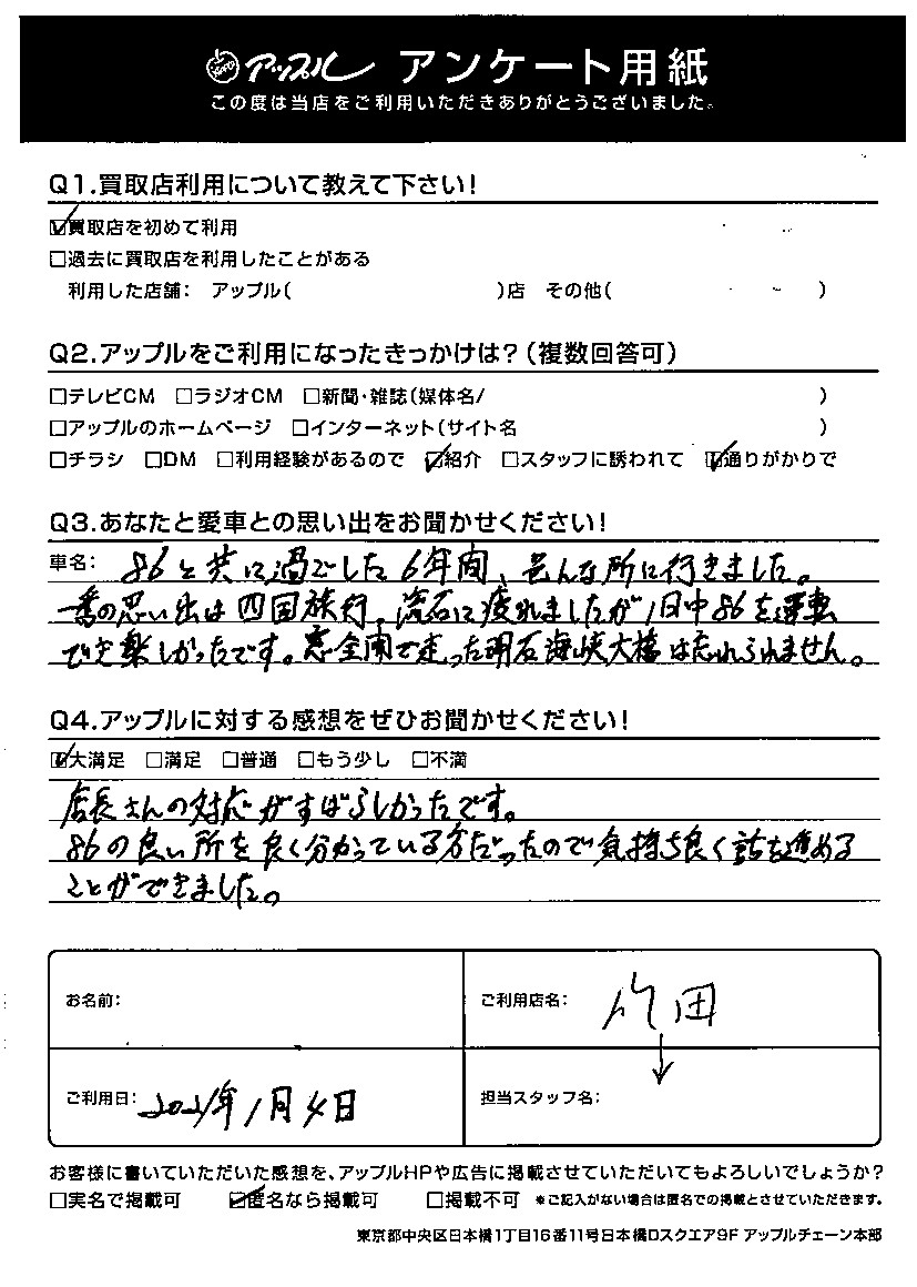 お車のご相談・ 査定だけでもOK! カンタン 入力 30秒 アップルがブランド買取始めました! お電話でも受付中! 受付時間10:00 ~ 19:00(新規ご査定の受付は18:30までとなります。) 0533-66-6666 お車のご相談・ 査定だけでもOK! カンタン 入力 30秒 アップルがブランド買取始めました! お電話でも受付中! 受付時間10:00 ~ 19:00(新規ご査定の受付は18:30までとなります。) 0533-66-6666 アップルがブランド買取始めました! お電話でも受付中! 受付時間10:00 ~ 19:00(新規ご査定の受付は18:30までとなります。) 0533-66-6666 店舗情報 在庫車 スタッフ紹介 ブログ お客様の声 キャンペーン お得 無料査定 click お客様の声 ご記入日: 2021/01/04 愛知県 匿名希望様 車名:トヨタ 86 店長さんの対応がすばらしかったです。86の良い所を良く分かっている方だったので気持ち良く話を進めることができました。 前へ 次へ お客様の声一覧を見る