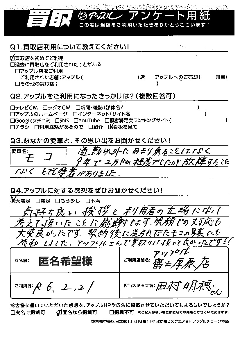 気持ち良い挨拶と利用者の立場になって考えて頂いた
