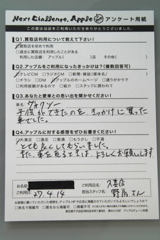Q:あなたと愛車との思い出を聞かせください! 車名:ヴォクシー 子供ができたのを、きっかけに買った車でした。 Q:アップルに対する感想をぜひお書きください! 大満足 とても良くしてもらいました。また車を売るときは、よろしくお願いします。 K様、こちらこそ今後ともよろしくお願いします!今後も一人でも多くのお客様に満足して頂けるような店舗を目指していきたいと思います!K様、本当にありがとうございました!! スタッフ一同
