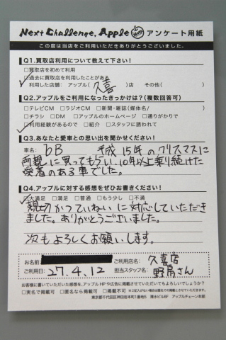 Q:あなたと愛車との思い出を聞かせください! 車名:bB 平成15年のクリスマスに両親に買ってもらい、10年以上乗り続けた愛着のある車でした 。 Q:アップルに対する感想をぜひお書きください! 大満足 親切かつ丁寧に対応していただきました。ありがとうございました。次もよろしくお願いします。 S様、愛車への愛着や思い出もプラス査定の重要な要素です!S様、10年以上大切に乗られてきた愛車をご売却頂きまして、本当にありがとうございました!今後ともよろしくお願いします! スタッフ一同