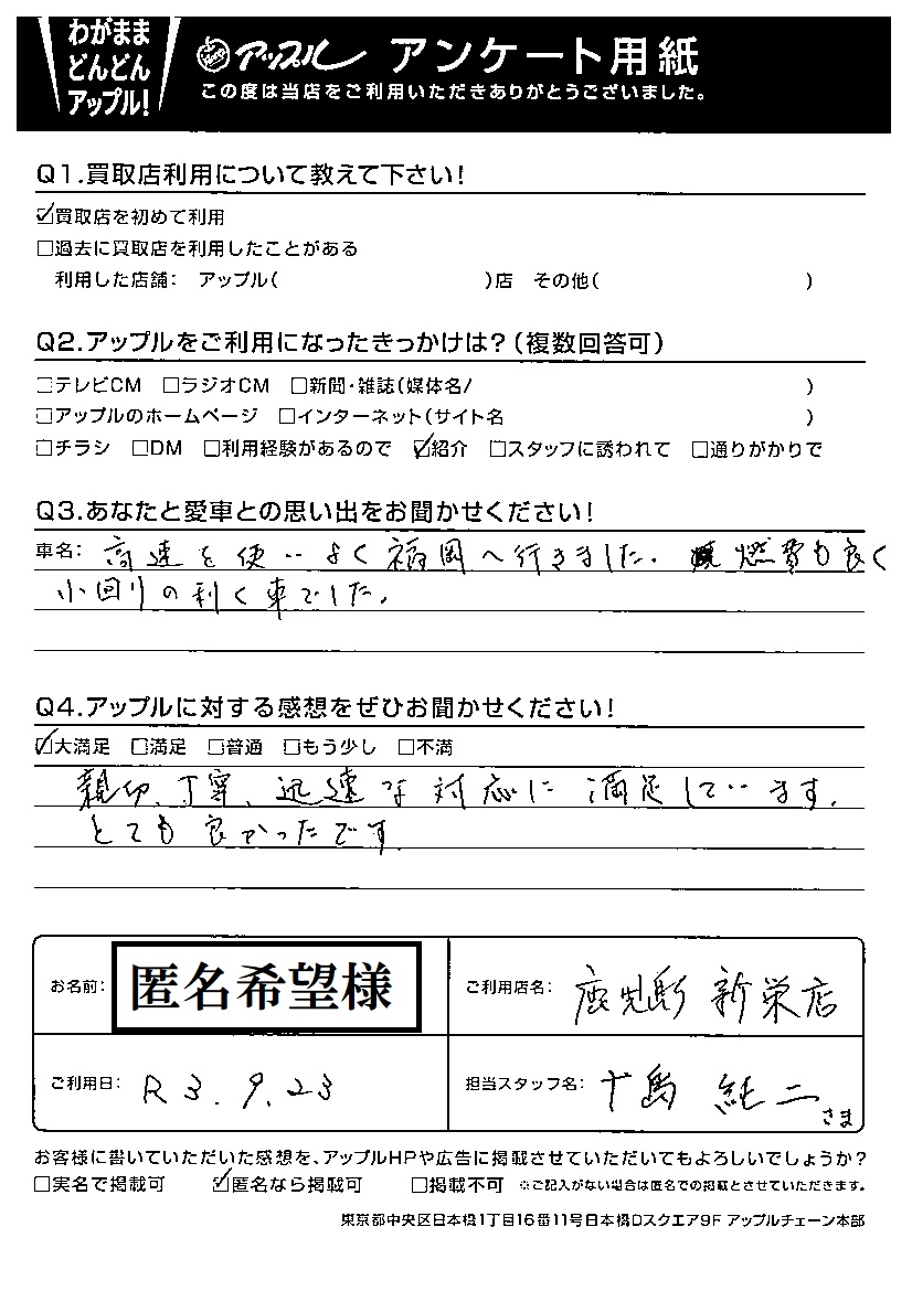 感想:親切、丁寧、迅速な対応に満足しています。