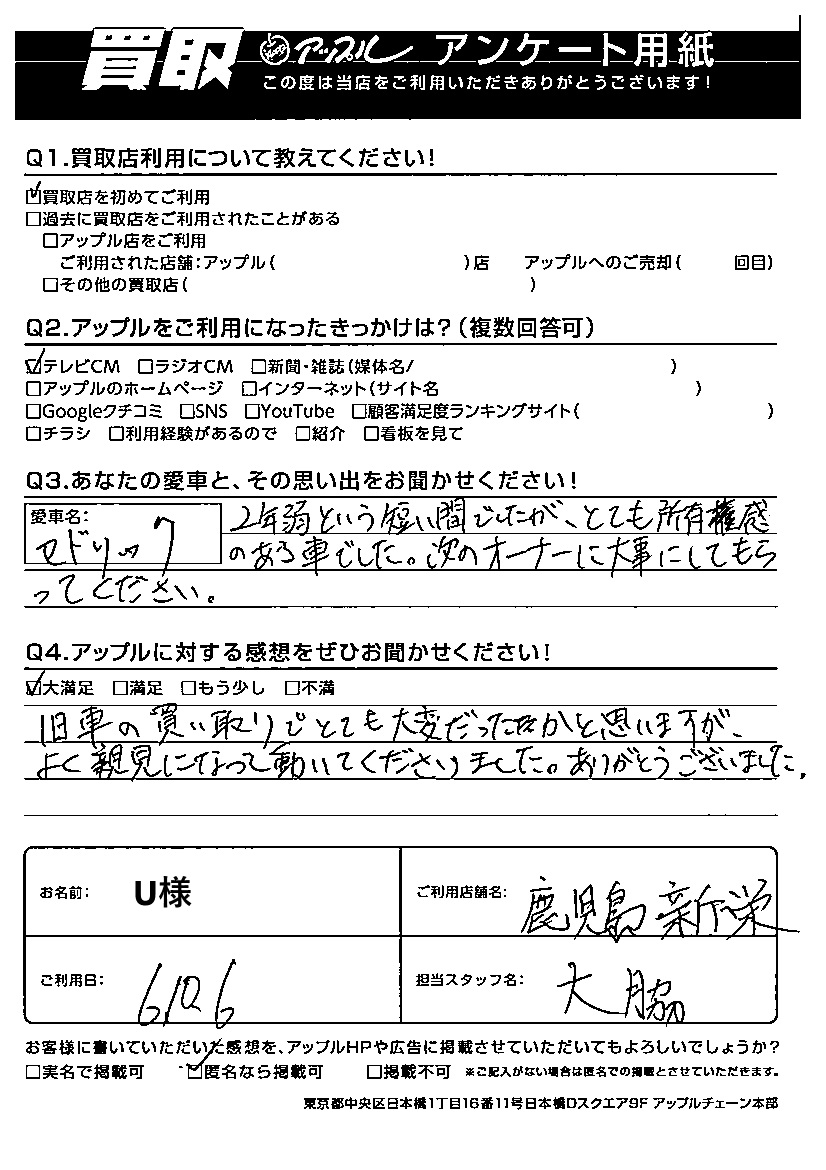 お車のご相談・ 査定だけでもOK! カンタン 入力 30秒 アップルがブランド買取始めました! お電話でも受付中! 受付時間10:00 ~ 19:00 099-213-1107 お車のご相談・ 査定だけでもOK! カンタン 入力 30秒 アップルがブランド買取始めました! お電話でも受付中! 受付時間10:00 ~ 19:00 099-213-1107 アップルがブランド買取始めました! お電話でも受付中! 受付時間10:00 ~ 19:00 099-213-1107 店舗情報 在庫車 スタッフ紹介 ブログ お客様の声 キャンペーン お得 無料査定 click お客様の声 ご記入日: 2024/10/06 鹿児島市 U様 車名:日産 セドリックセダン 旧車の買取でとても大変だったかと思いますがよく親身になって動いてくださいました。ありがとうございました。 前へ 次へ お客様の声一覧を見る
