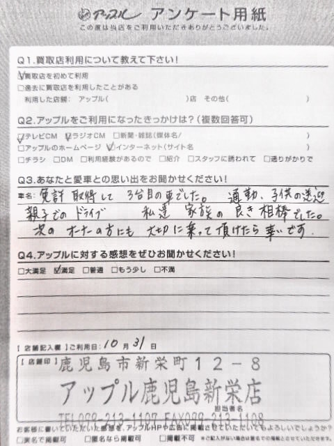 お車のご相談・ 査定だけでもOK! カンタン 入力 30秒 アップルがブランド買取始めました! お電話でも受付中! 受付時間10:00 ~ 19:00 099-213-1107 お車のご相談・ 査定だけでもOK! カンタン 入力 30秒 アップルがブランド買取始めました! お電話でも受付中! 受付時間10:00 ~ 19:00 099-213-1107 アップルがブランド買取始めました! お電話でも受付中! 受付時間10:00 ~ 19:00 099-213-1107 店舗情報 在庫車 スタッフ紹介 ブログ お客様の声 キャンペーン お得 無料査定 click お客様の声 ご記入日: 2019/10/31 鹿児島県鹿児島市 A様 前へ 次へ お客様の声一覧を見る