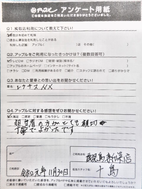 お車のご相談・ 査定だけでもOK! カンタン 入力 30秒 アップルがブランド買取始めました! お電話でも受付中! 受付時間10:00 ~ 19:00 099-213-1107 お車のご相談・ 査定だけでもOK! カンタン 入力 30秒 アップルがブランド買取始めました! お電話でも受付中! 受付時間10:00 ~ 19:00 099-213-1107 アップルがブランド買取始めました! お電話でも受付中! 受付時間10:00 ~ 19:00 099-213-1107 店舗情報 在庫車 スタッフ紹介 ブログ お客様の声 キャンペーン お得 無料査定 click お客様の声 ご記入日: 2019/11/30 鹿児島県鹿児島市 N様 車名:レクサス NX (国内仕様 右H) 担当者の 前へ 次へ お客様の声一覧を見る