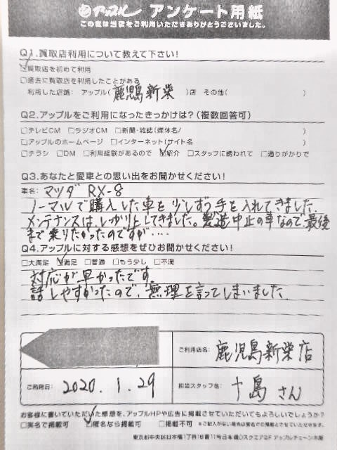 お車のご相談・ 査定だけでもOK! カンタン 入力 30秒 アップルがブランド買取始めました! お電話でも受付中! 受付時間10:00 ~ 19:00 099-213-1107 お車のご相談・ 査定だけでもOK! カンタン 入力 30秒 アップルがブランド買取始めました! お電話でも受付中! 受付時間10:00 ~ 19:00 099-213-1107 アップルがブランド買取始めました! お電話でも受付中! 受付時間10:00 ~ 19:00 099-213-1107 店舗情報 在庫車 スタッフ紹介 ブログ お客様の声 キャンペーン お得 無料査定 click お客様の声 ご記入日: 2020/01/29 鹿児島県鹿児島市 F様 車名:マツダ RX-8 対応が… 前へ 次へ お客様の声一覧を見る