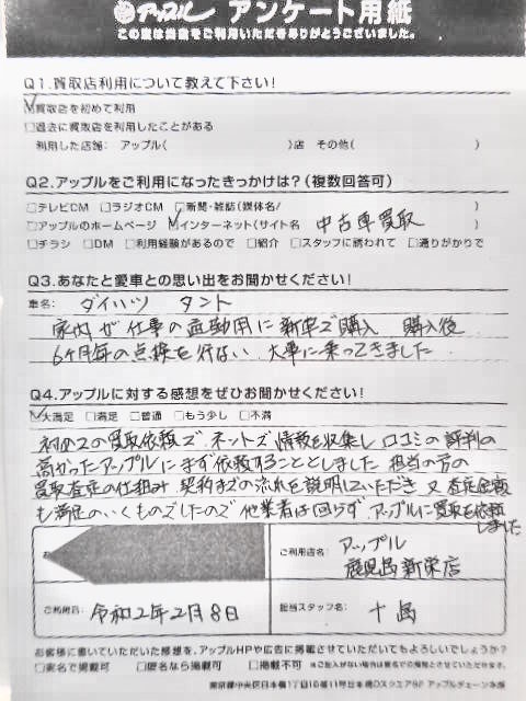 お車のご相談・ 査定だけでもOK! カンタン 入力 30秒 アップルがブランド買取始めました! お電話でも受付中! 受付時間10:00 ~ 19:00 099-213-1107 お車のご相談・ 査定だけでもOK! カンタン 入力 30秒 アップルがブランド買取始めました! お電話でも受付中! 受付時間10:00 ~ 19:00 099-213-1107 アップルがブランド買取始めました! お電話でも受付中! 受付時間10:00 ~ 19:00 099-213-1107 店舗情報 在庫車 スタッフ紹介 ブログ お客様の声 キャンペーン お得 無料査定 click お客様の声 ご記入日: 2020/02/08 鹿児島県鹿児島市 S様 車名:ダイハツ タント 初めての… 前へ 次へ お客様の声一覧を見る