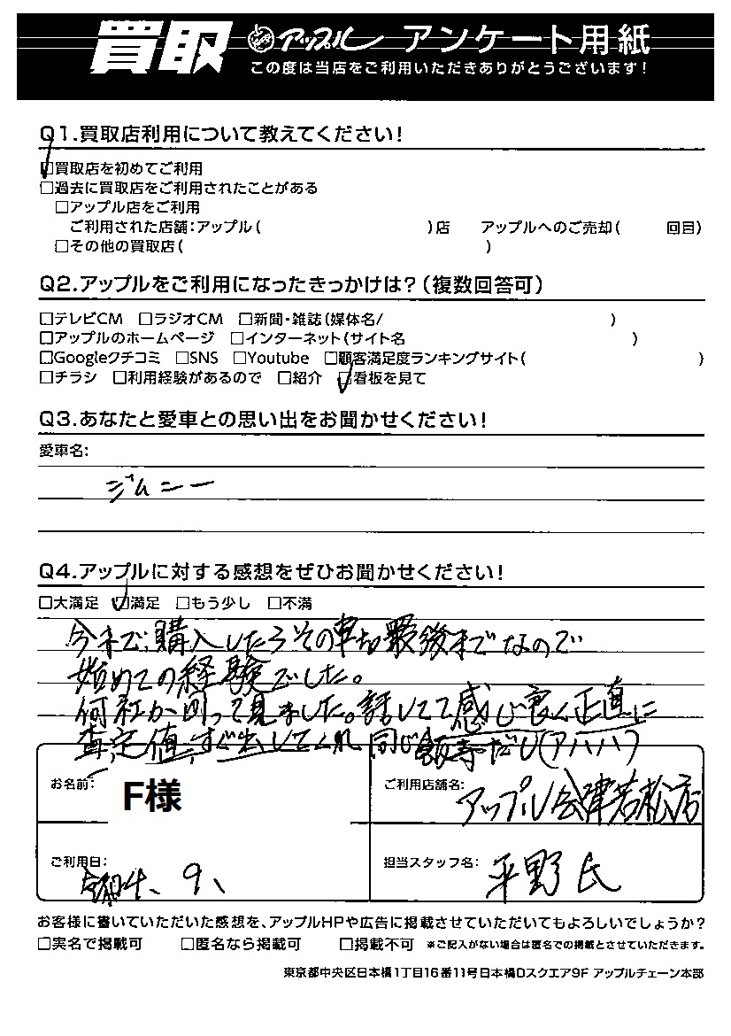 今まで購入したら その車を最後までなので始めての経験でした。何社か回って見ました。話してて感じが良く正直に査定値、すぐに出してくれ同じ飯寺だし(アハハ)