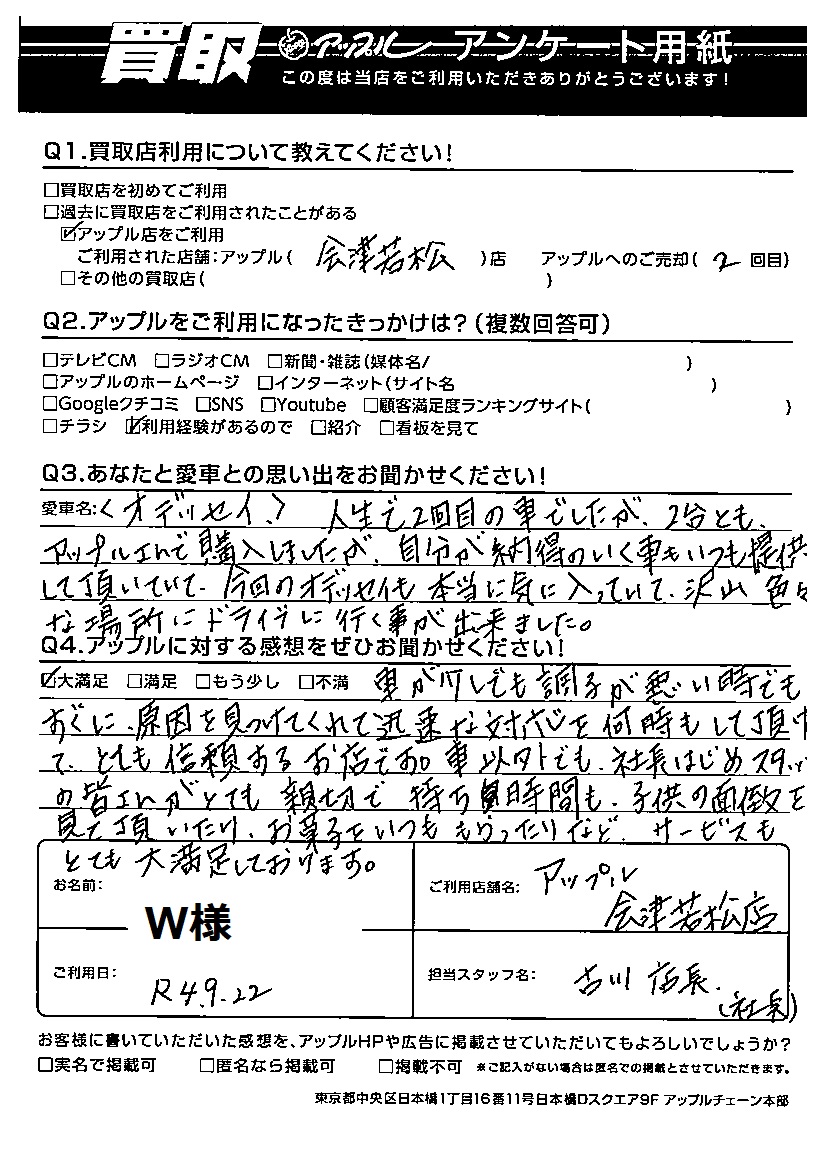 人生で2回目の車でしたが、2台ともアップルさんで購入しましたが、自分が納得いく車もいつも提供して頂いていて、今回のオデッセイも本当に気に入っていて、沢山色々な場所にドライブに行く事が出来ました。