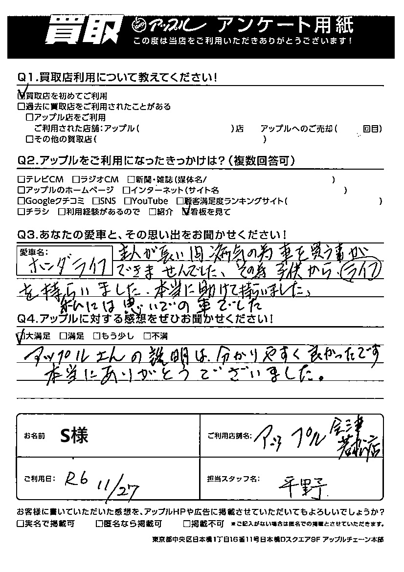 A:主人が長い間病期のため、車を買うことが出来ませんでした。