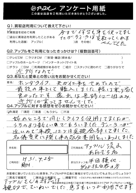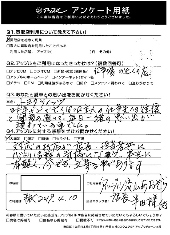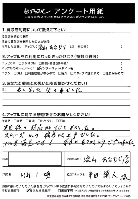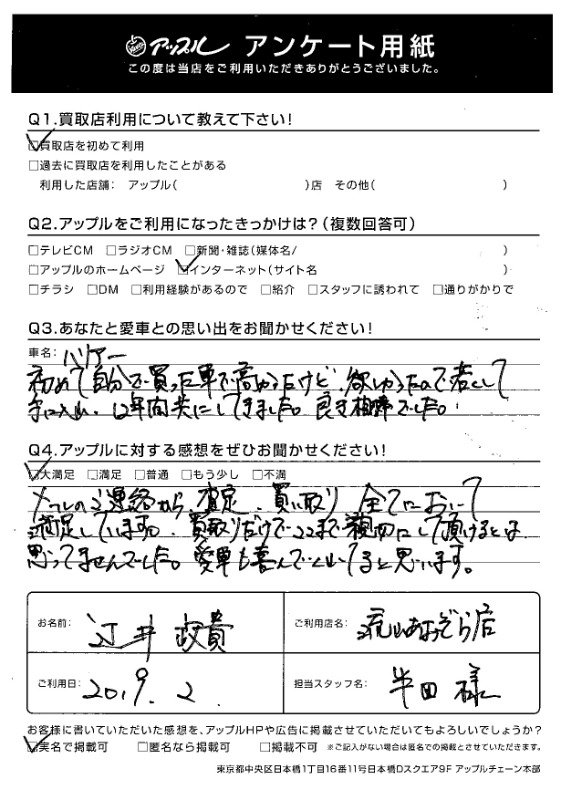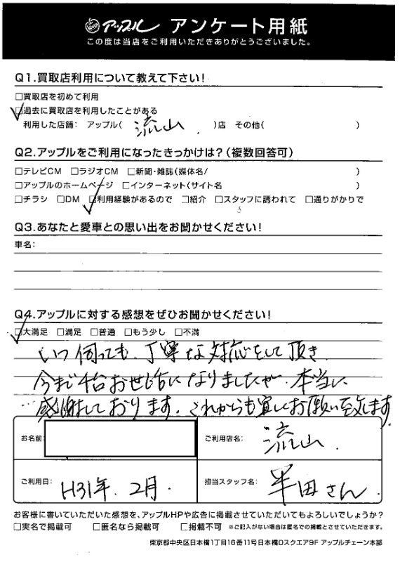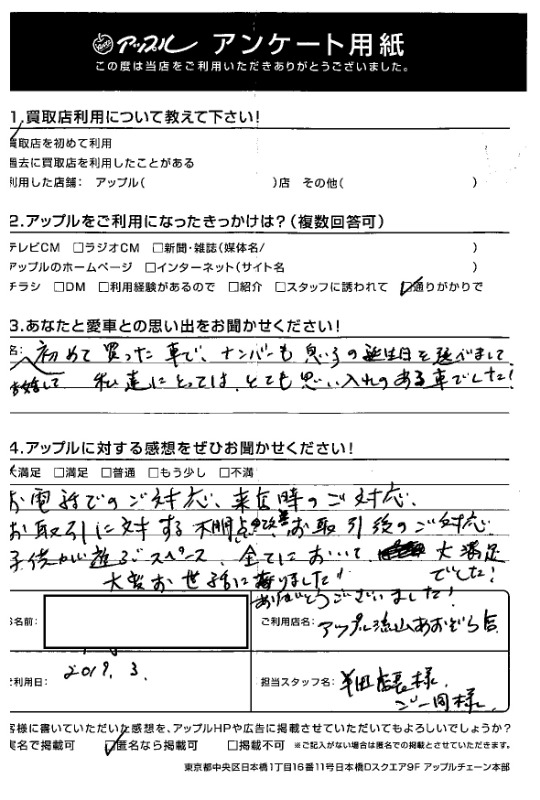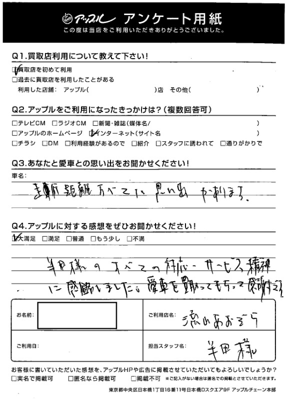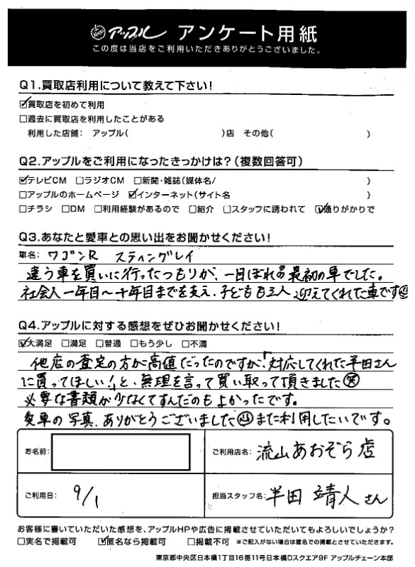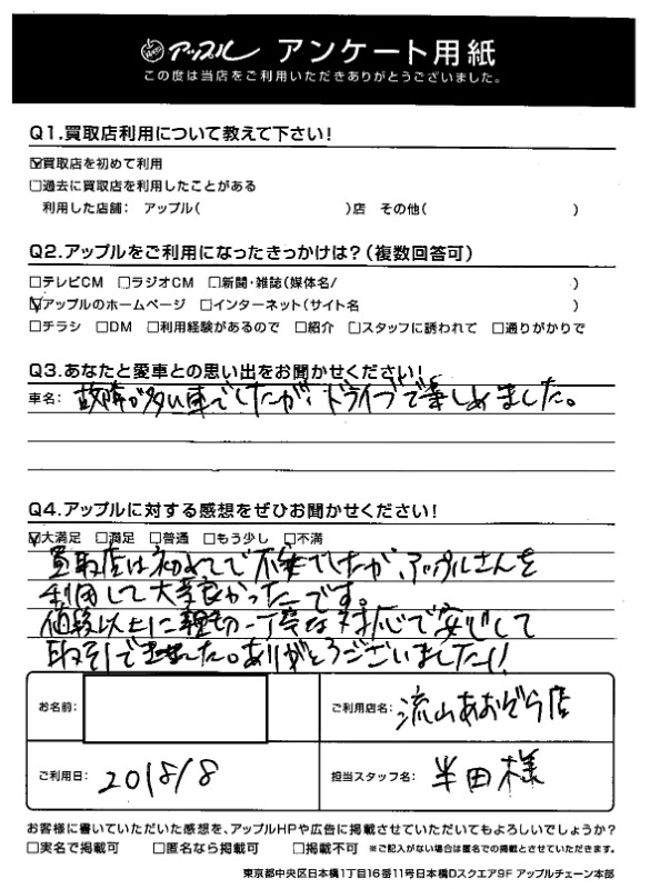 お車のご相談・ 査定だけでもOK! カンタン 入力 30秒 アップルがブランド買取始めました! お電話でも受付中! 受付時間10:00 ~ 18:30 0120-703-903 お車のご相談・ 査定だけでもOK! カンタン 入力 30秒 アップルがブランド買取始めました! お電話でも受付中! 受付時間10:00 ~ 18:30 0120-703-903 アップルがブランド買取始めました! お電話でも受付中! 受付時間10:00 ~ 18:30 0120-703-903 店舗情報 在庫車 スタッフ紹介 ブログ お客様の声 キャンペーン お得 無料査定 click [ 未分類 ] 2019/06/02 (日) 17:48 お客様の声 こんにちは!アップル半田でございます。本日も引き続き、なぜ半田がお客様からご支持をいただけているのかをご紹介させていただきます!本当にありがとうございます!一部ではありますが、ご紹介をさせていただきました。やっぱり愛車を売るならまたお願いしたい!と感じていただけるような存在であり続けたい。そう改めて感じた今日このごろです。 2019-06-02 17:48:15 新しい記事へ 古い記事へ 最新記事 初めての売却でも安心♪☆スカイラインご成約ありがとうございました☆春の気配3月限定!令和8年度自動車税アップル全額負担!!ハイブリッドカー強化買取中 店舗情報に戻る 月別アーカイブ 2026年04月(2)2026年03月(4)2026年02月(12)2026年01月(16)2025年12月(13)2025年11月(13)2025年10月(29)2025年09月(15)2025年08月(23)2025年07月(22)2025年06月(11)2025年05月(4)2025年04月(5)2025年03月(4)2025年02月(6)2025年01月(5)2024年12月(6)2024年11月(5)2024年10月(7)2024年09月(1)2024年08月(4)2024年07月(1)2024年06月(1)2024年04月(2)2023年12月(1)2023年11月(1)2023年08月(1)2023年07月(2)2023年06月(2)2023年05月(1)2023年04月(1)2023年03月(1)2023年02月(2)2023年01月(1)2022年12月(1)2022年10月(1)2022年09月(3)2022年08月(2)2022年07月(1)2022年04月(2)2022年03月(3)2022年01月(3)2021年12月(11)2021年11月(2)2021年10月(1)2021年09月(3)2021年08月(5)2021年07月(6)2021年06月(8)2021年05月(5)2021年04月(2)2021年03月(2)2021年02月(2)2021年01月(4)2020年12月(3)2020年11月(4)2020年10月(4)2020年09月(7)2020年08月(6)2020年07月(12)2020年06月(9)2020年05月(7)2020年04月(8)2020年03月(10)2020年02月(8)2020年01月(9)2019年12月(10)2019年11月(8)2019年10月(22)2019年09月(8)2019年06月(3)2019年05月(8)2019年04月(2)2019年03月(1)2019年02月(3)2019年01月(2)2018年12月(5)2018年11月(6)2018年10月(1)2018年09月(6)2018年08月(7)2018年07月(8)2018年06月(3)2018年05月(3)2018年04月(4)2018年03月(6)2018年02月(5)2018年01月(8)2017年12月(7)2017年11月(7)2017年10月(8)2017年09月(8)2017年08月(7)2017年07月(11)2017年06月(9)2017年05月(5)2017年04月(12)2017年03月(9)2017年02月(11)2017年01月(12)2016年12月(16)2016年11月(23)2016年10月(31)2016年09月(30)2016年08月(15)2016年07月(5)2016年06月(17)2016年05月(6)2016年04月(4)2016年03月(3)2016年02月(6)2016年01月(8)2015年12月(6)2015年11月(5)2015年10月(6)2015年09月(6)2015年08月(8)2015年07月(11)2015年06月(8)2015年05月(6)2015年04月(7)2015年03月(7)2015年02月(9)2015年01月(11)2014年12月(14)2014年11月(18)2014年10月(17)2014年09月(17)2014年08月(12)2014年07月(15)2014年06月(6)