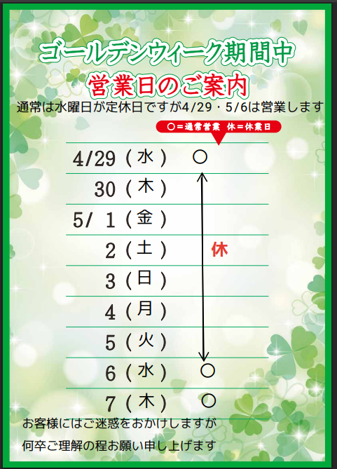 ゴールデンウィーク営業日のお知らせ