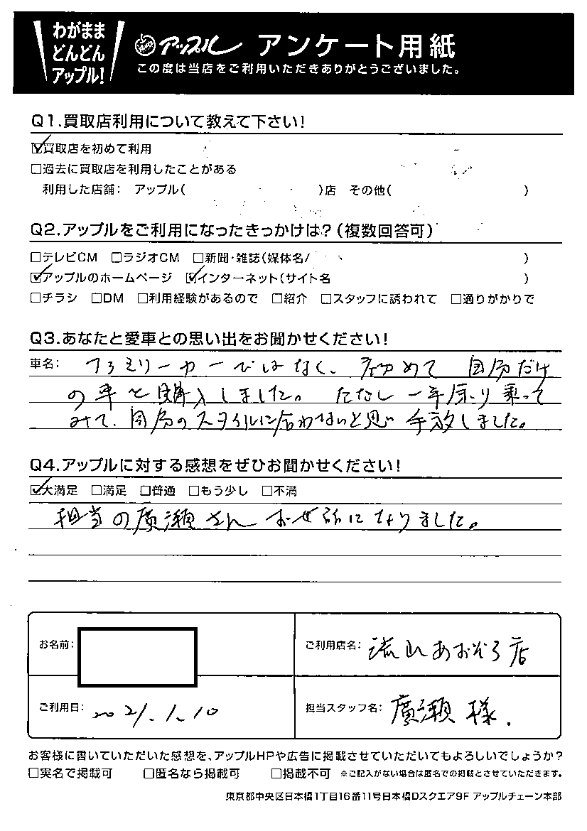 ファミリーカーではなく、初めて自分だけの車と購入しました。ただし一年余り乗ってみて自分のスタイルに合わないと思い手放しました。